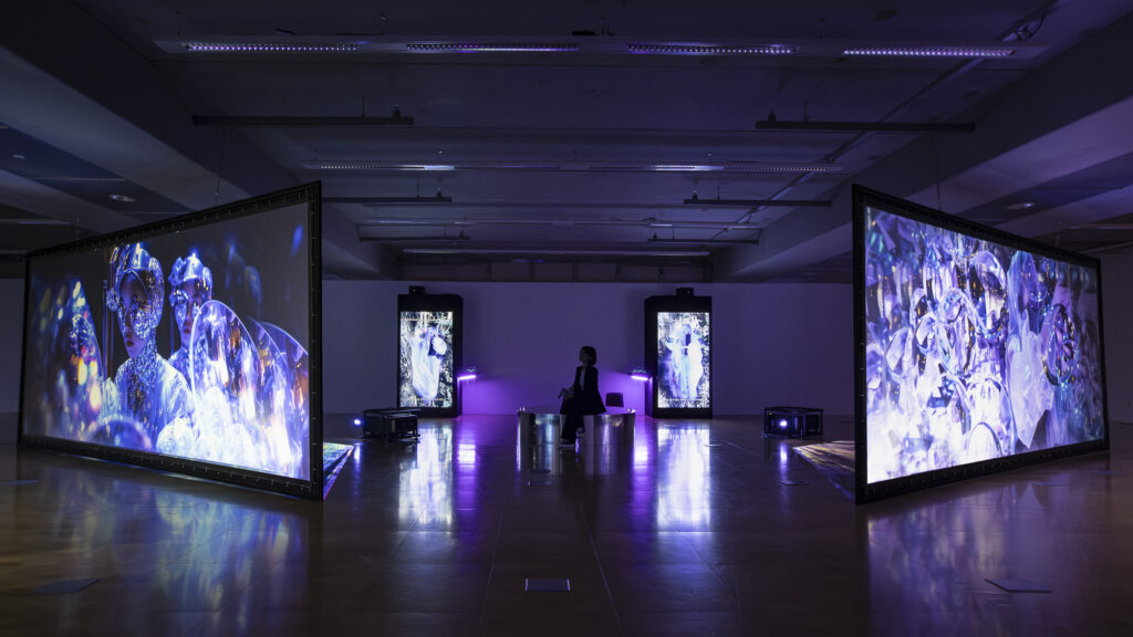 염인화 작가의 〈찬드라 연대기 : 인 뉴로버스〉 는 전시 주제인 ‘뉴로버스(Neuroverse)’ 의 세계관 속에서, 신경망 환경을 관리하는 ‘찬드라’들의 연대기를 펼치는 XR 연작이다. 〈애프터 찬드라(A.C.)〉, 〈비포 찬드라(B.C.)〉, 〈한창의 찬드라(C.C.)〉 라는 세 개의 시공간 차원에 구축된 이 신경망 환경은 실물 현실, 증강현실(AR), 가상현실(VR)을 넘나드는 다양한 현실 매체로 확장·연동되며, 전시장 전역에 걸쳐 실시간 상호작용을 만들어낸다. 이곳에서 관객은 찬드라가 되어, 서로 다른 시공간 차원을 매개하는 수행자로 참여한다.